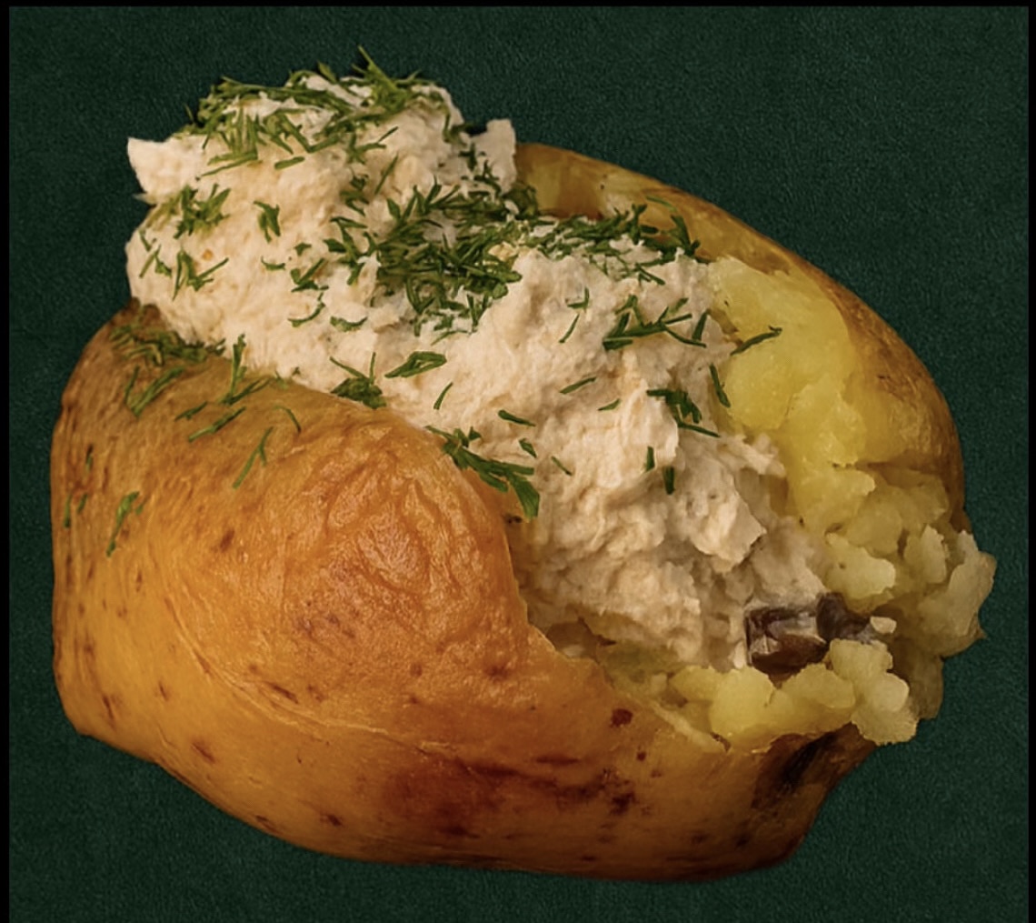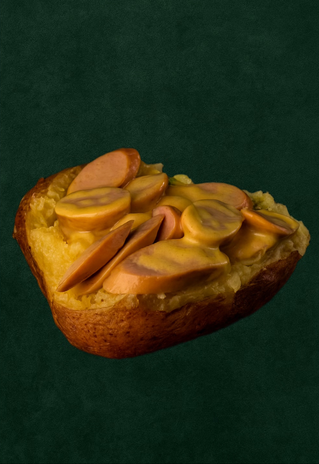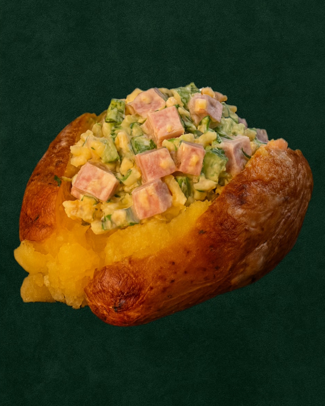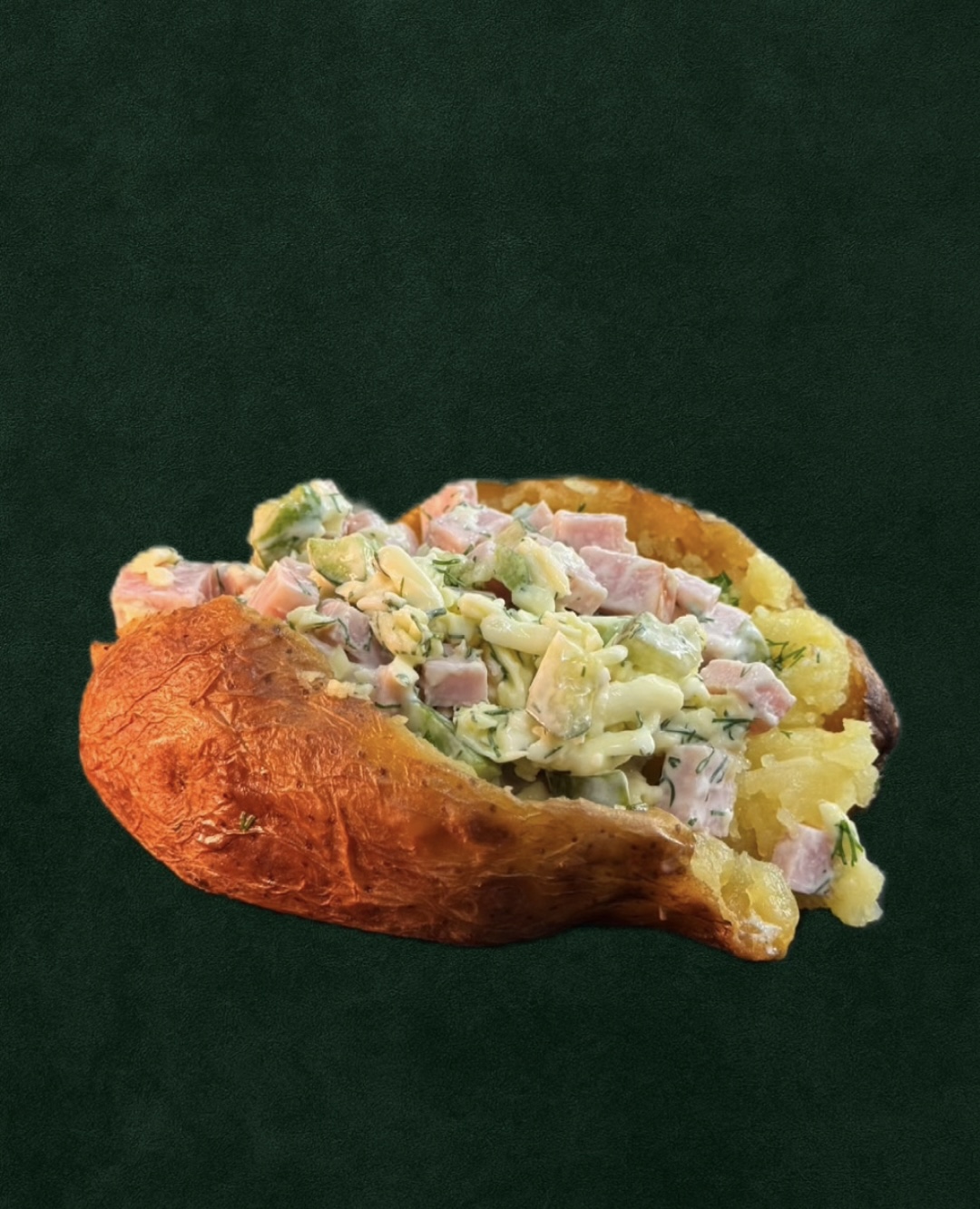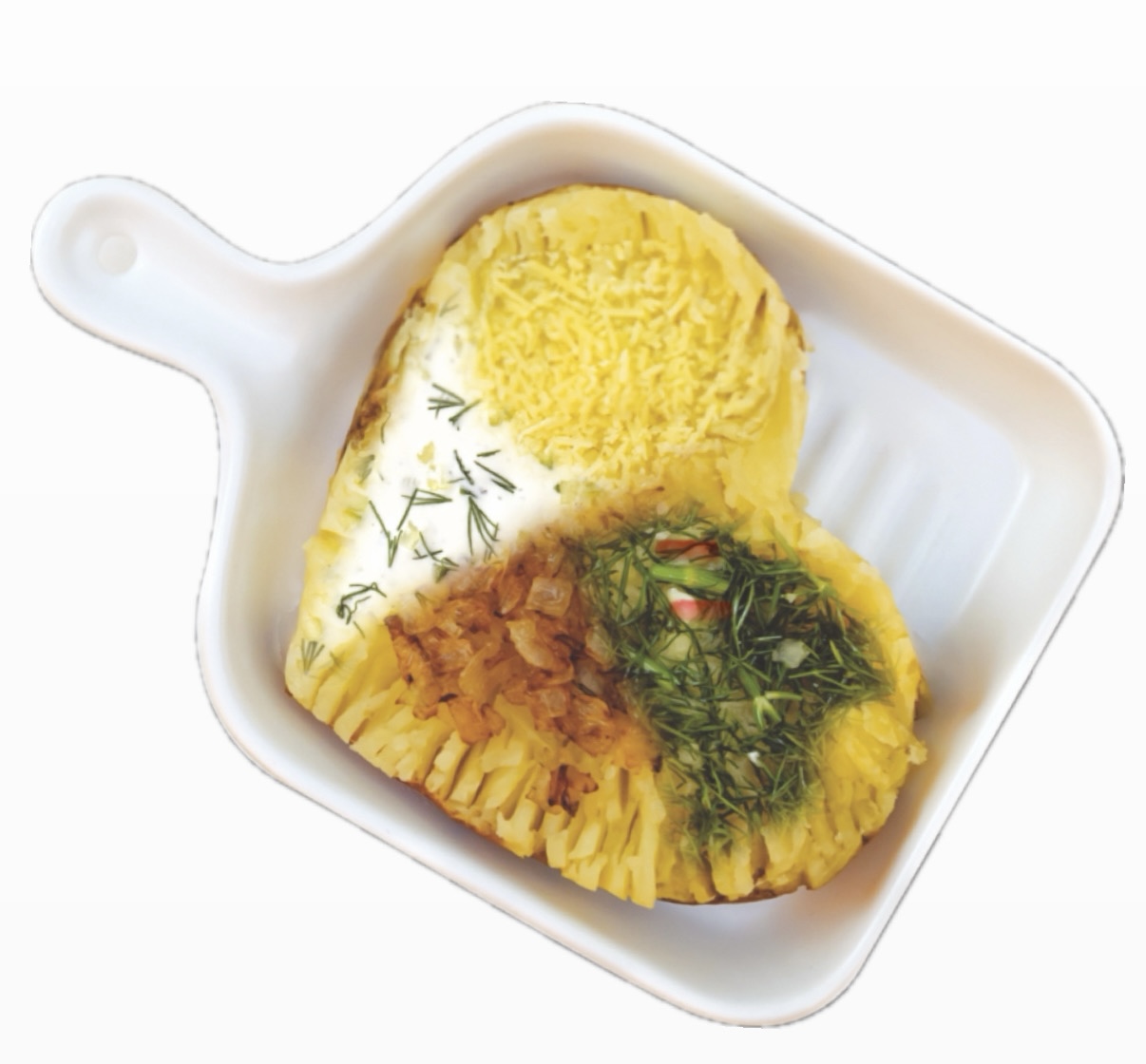 Then, top your potato with a variety of toppings - vegetable, meat, or seafood options. Signature and traditional Slavic flavors, both premium and popular.