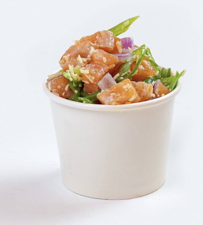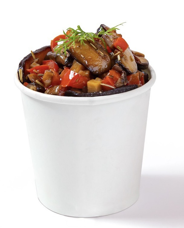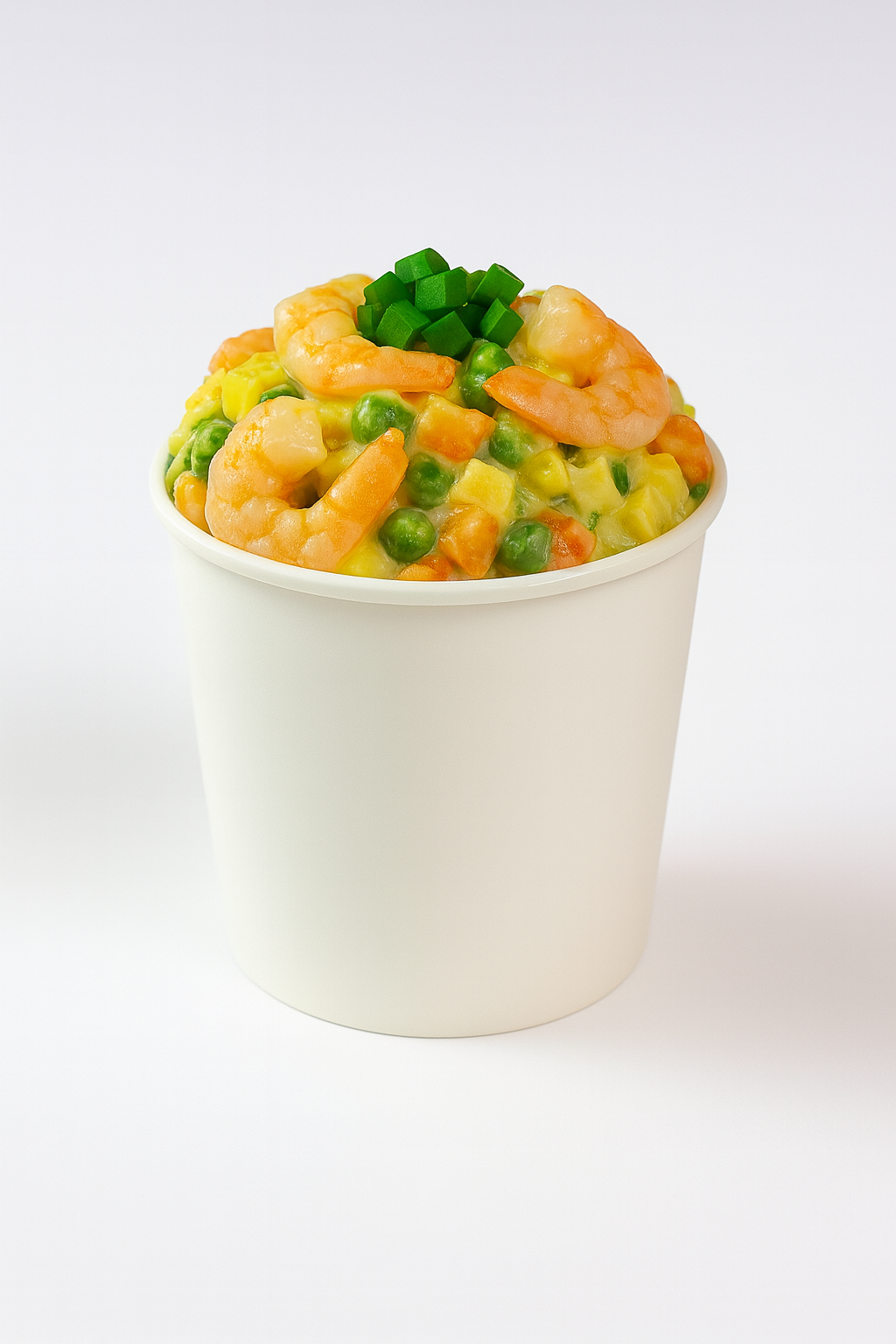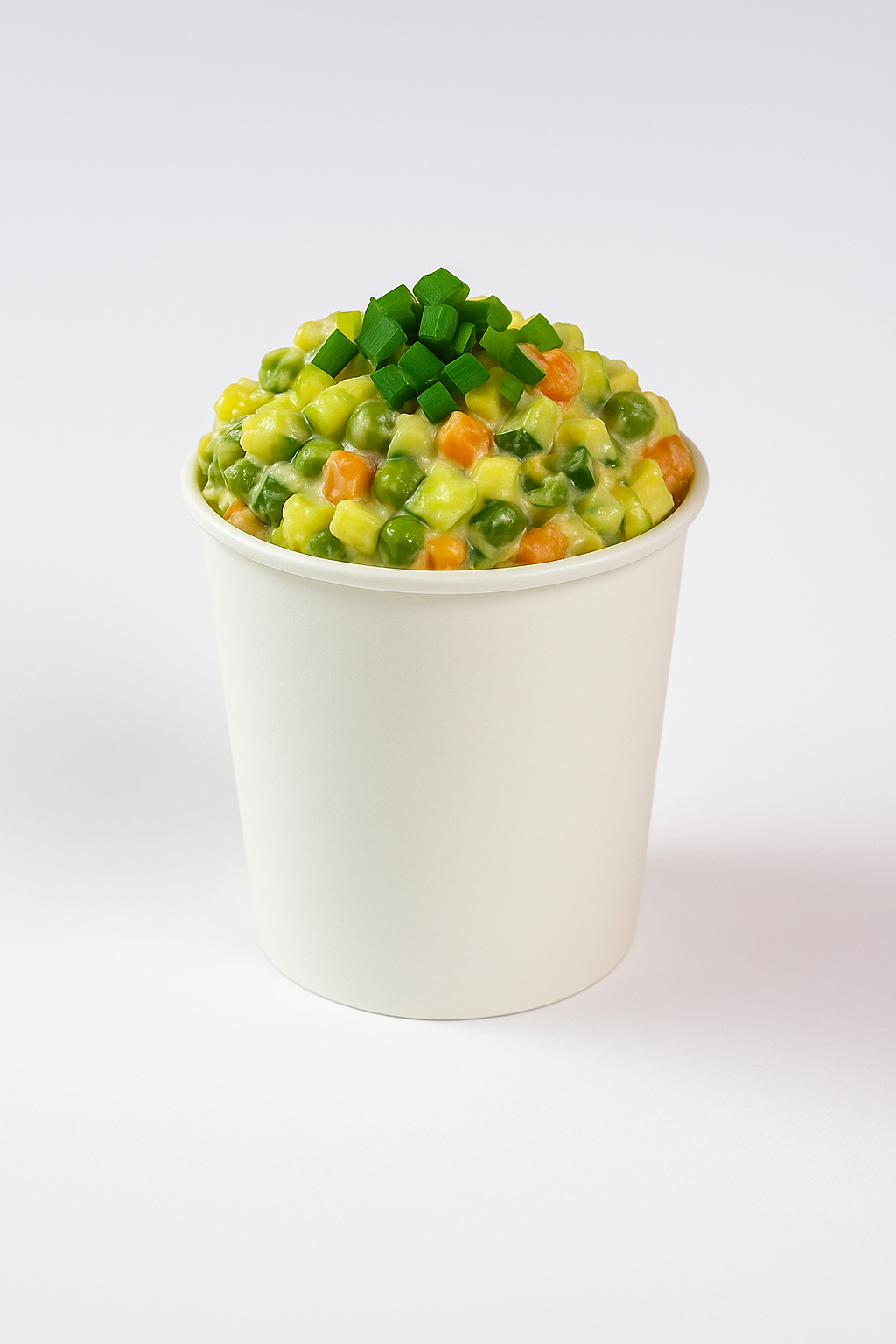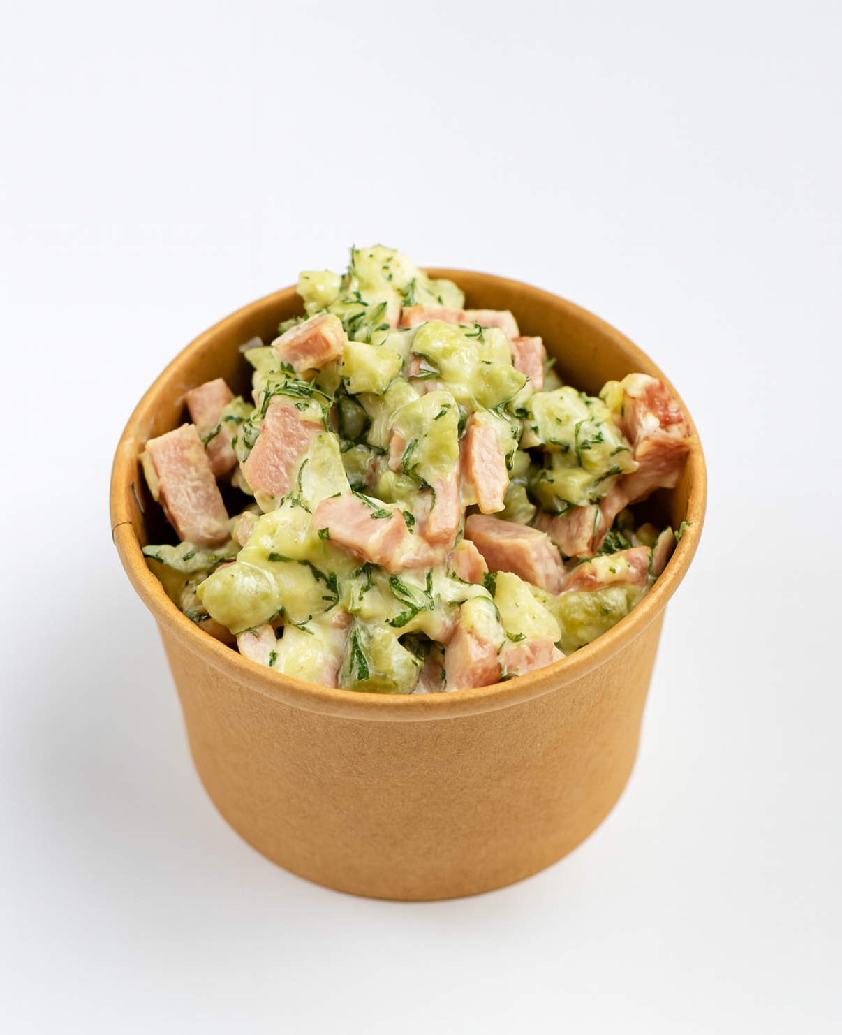 Topping: Signature salad of boiled carrot, fresh and pickled cucumbers, avocado, green peas, shrimps and light vegan mayonnaise