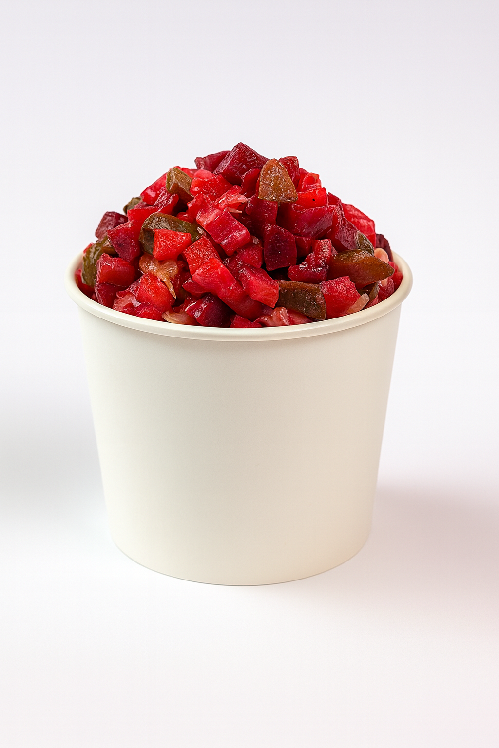 Topping: Boiled beets and carrots, pickled cucumbers, lightly salted cucumbers, white onion, red onion, sauerkraut, aromatic sunflower oil