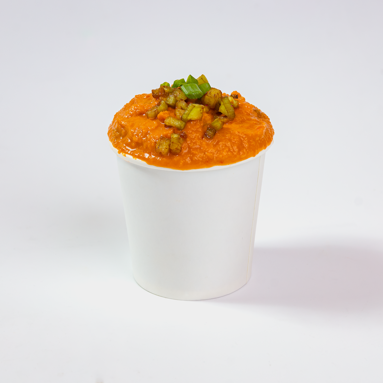 Topping: Signature salad of boiled carrot, fresh and pickled cucumbers, avocado, green peas, and light vegan mayonnaise