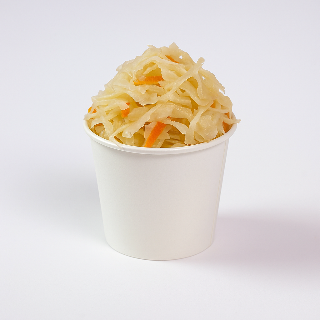 Topping: Fermented cabbage with carrots. Served with onion and aromatic sunflower oil.