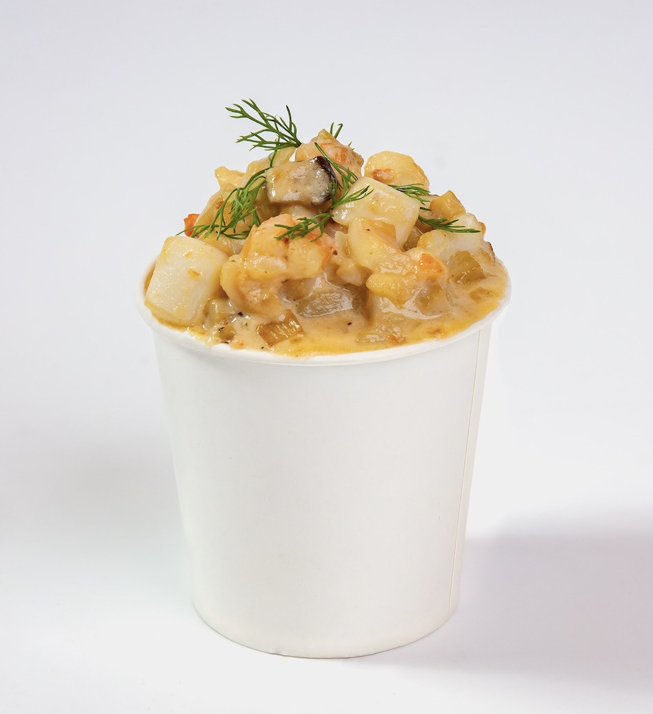 Topping: Scallops, prawns, and squid in a warm creamy cheese sauce with mushrooms