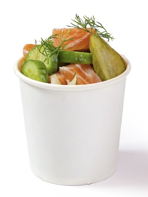 Topping: Lightly salted salmon with fresh, lightly salted, and pickled cucumbers, and onion