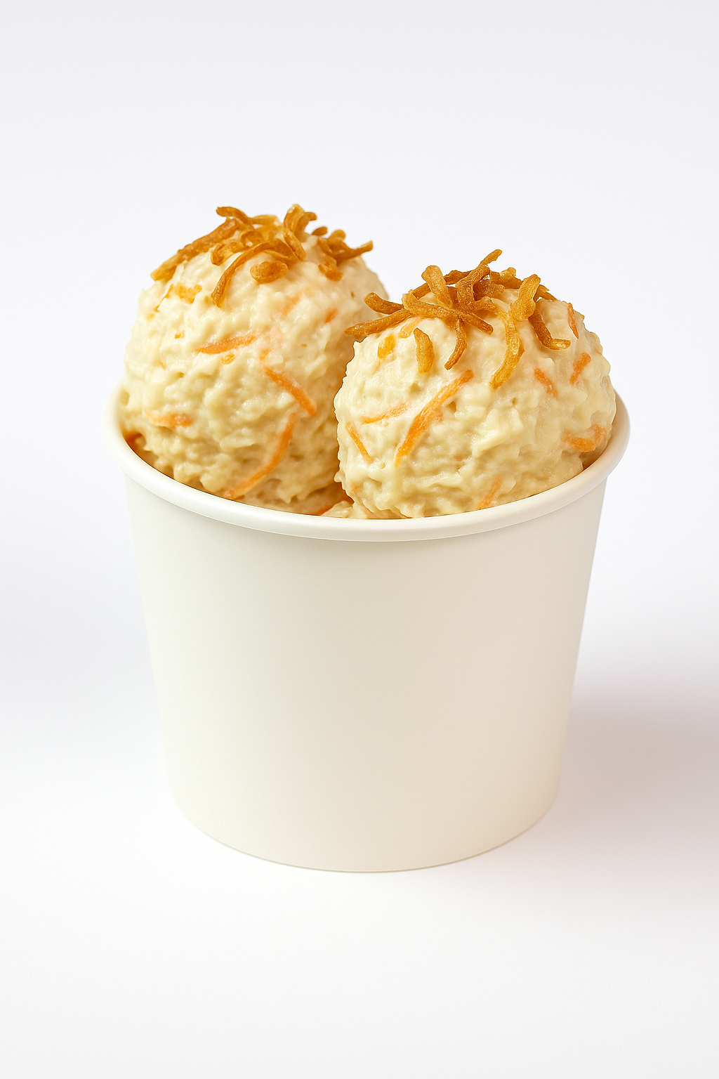 Topping: Delicate combination of shrimp, squid, chopped egg white, and boiled carrot with cold cream cheese , egg white, boiled carrot and crispy onion fries